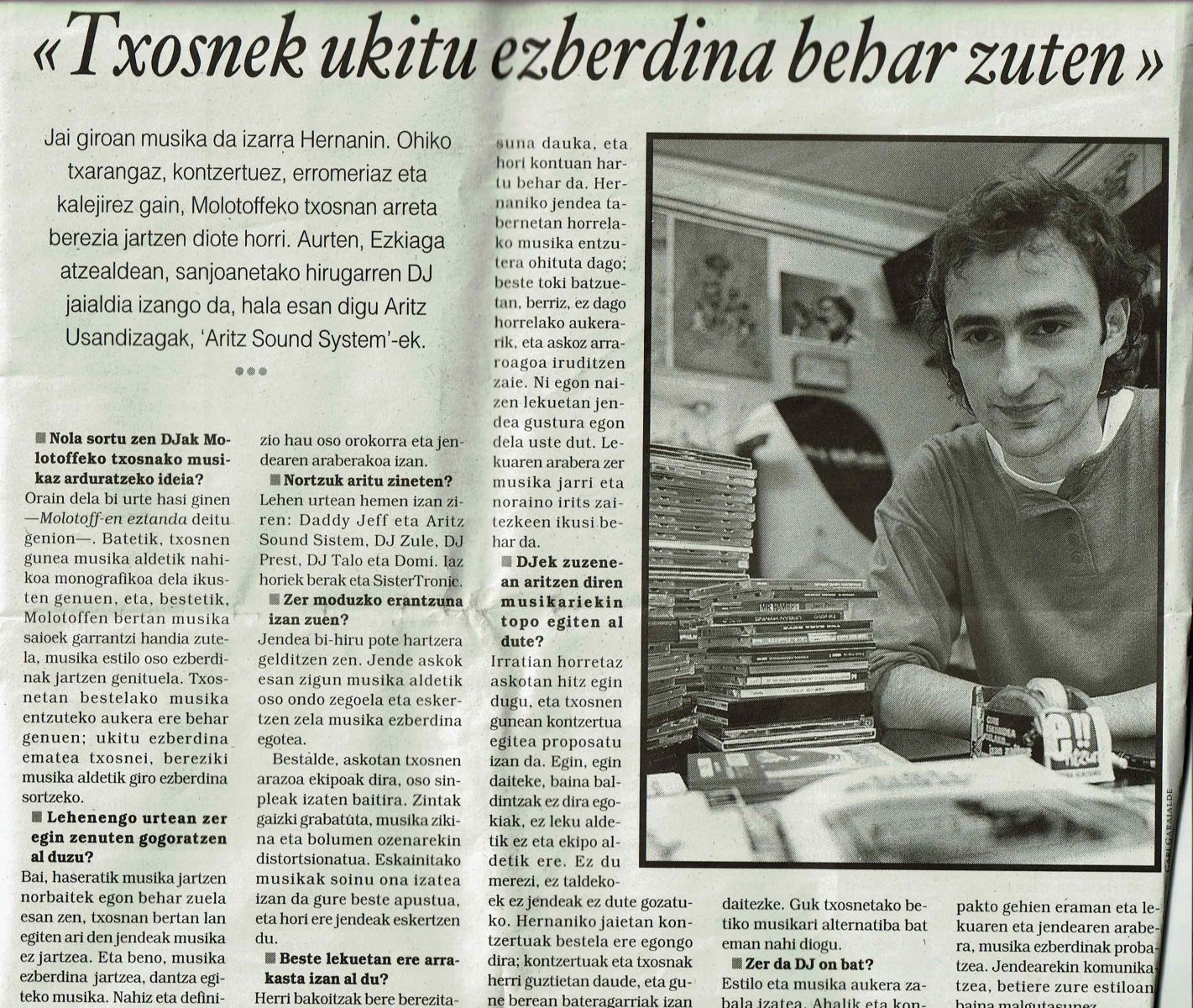 ARITZ Usandizagak iazko Durangoko Azokara begira   bere  aurreneko liburua aurkeztu zuen, ‘Bob Marley, begirunea, maitasuna eta askatasuna’ tituluarekin. Hori aitzakiatzat hartuta bere musika dendara hurbildu eta azkeneko urteetan bere pasioa izan denari buruz galdetu diogu: musika. Izan ere musikaren inguruko hamaika kontutan ibili da: Egin Irratian eta Molotoff Irratian musika saioak eginez,  Aritz Sound System ezizenenarekin DJ lanetan aritzen da, Entzun musika aldizkarian ere sartuta dabil,   musika denda, Selektah Kolektiboa, eta abar.